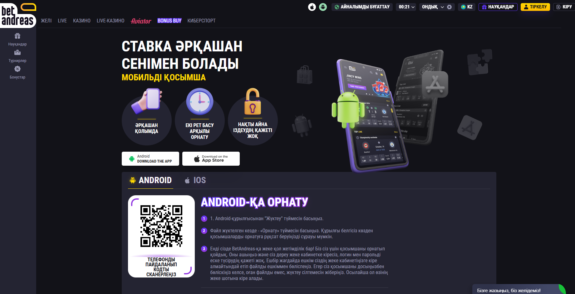 Қосымшаны ресми сайттан Betandreas kz бөлімінен «Мобильді қосымша» жүктеп алуға болады.