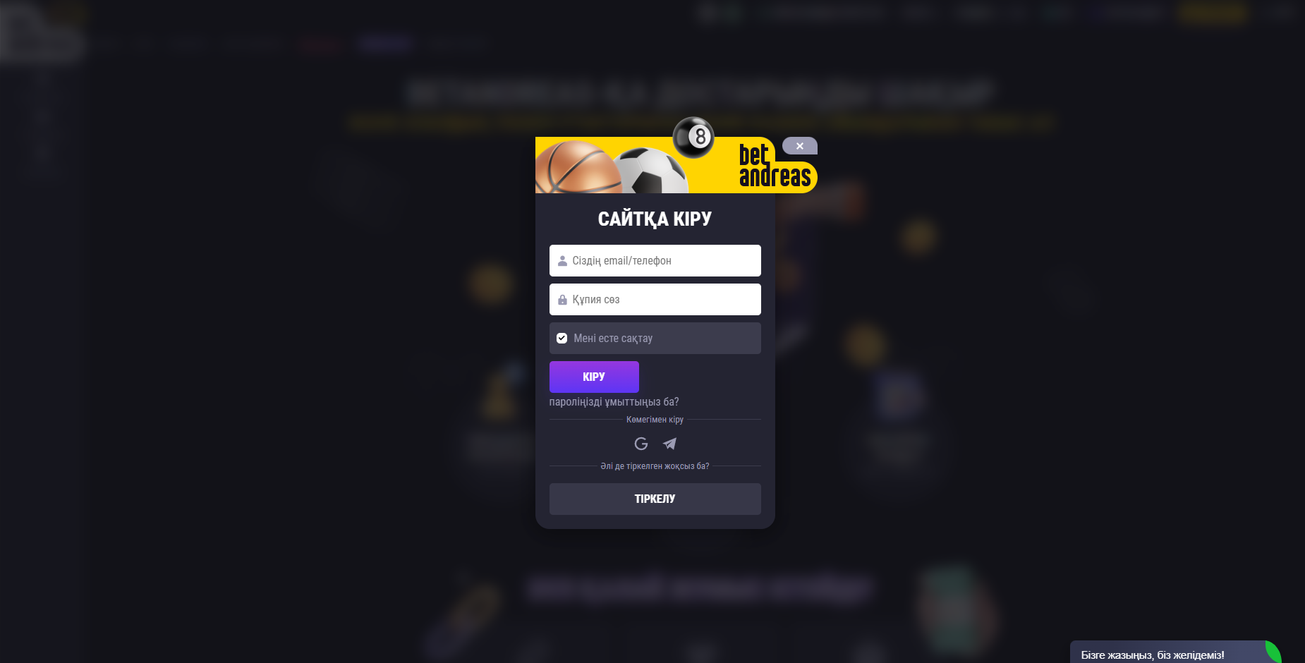 - Betandreas login арқылы кіру немесе жаңа аккаунт жасау.